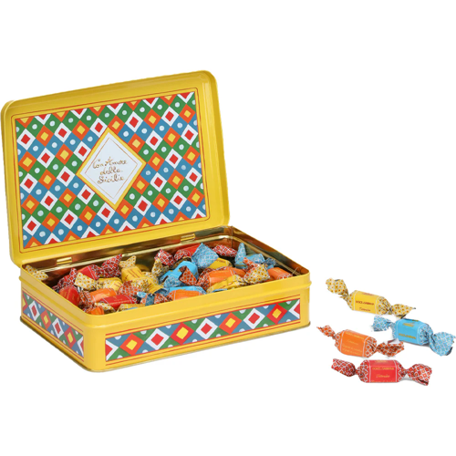 Emballés dans une boîte métallique artistiquement conçue par Dolce & Gabbana et décorée de couleurs vives et de motifs siciliens traditionnels, ces nougats moelleux ne sont pas seulement un délicieux délice, mais aussi un cadeau luxueux ou un point de mire décoratif pour les occasions spéciales.